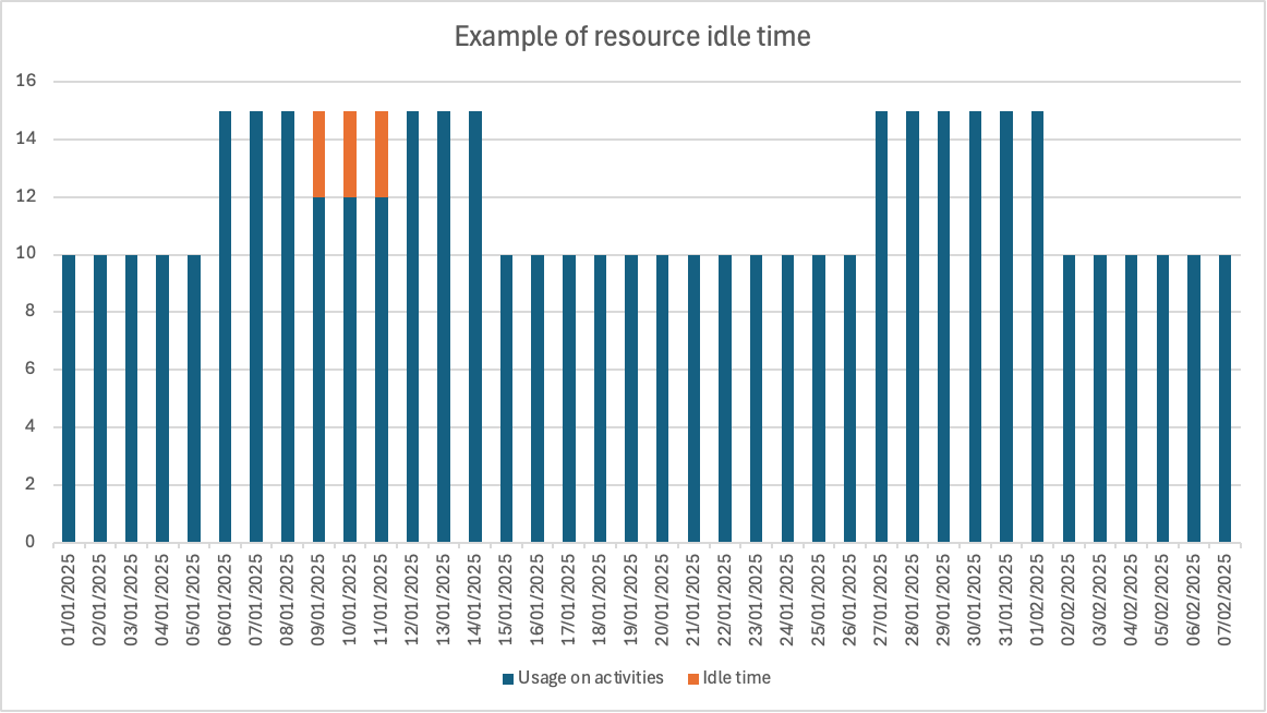 Example showing 3 mobilisation events (01/01: 10 units, 06/01: 5 units, 27/01: 5 units) and one idle period (07/01-11/01 for 3 units)