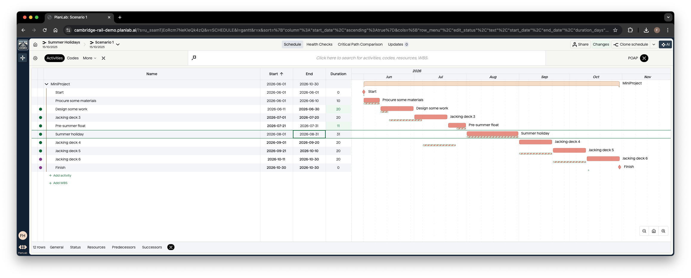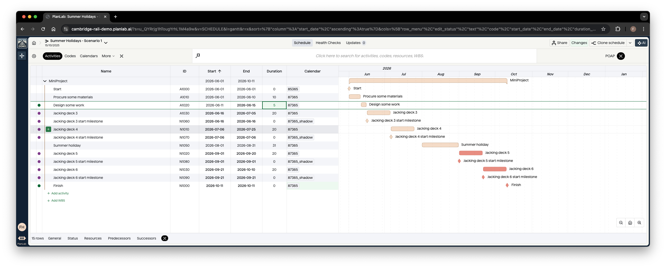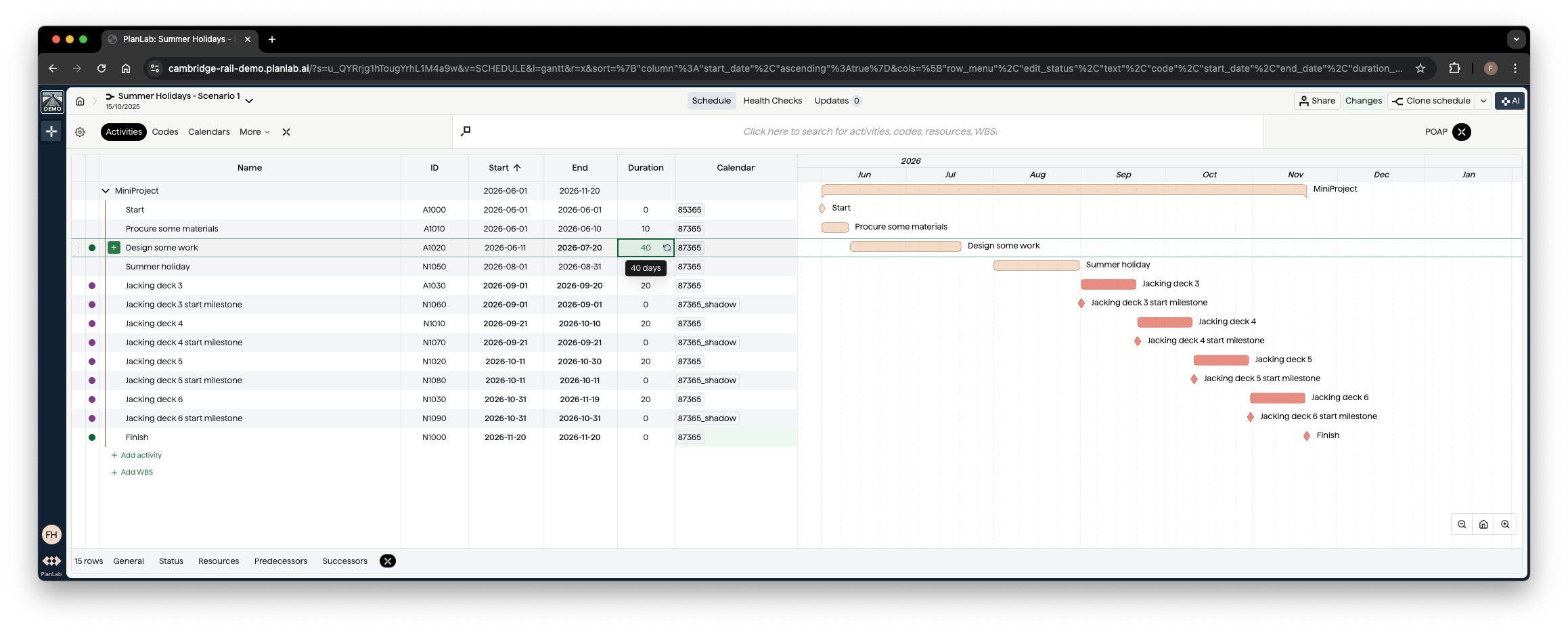 There's one more downside that's a bit more subtle - this doesn't allow all changes to work. If you change the duration of a "Jacking deck" activity, then its shadow on the calendar will be the wrong length. You need to pair up duration and calendar changes.